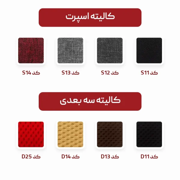 | کالیته برند تراست سیت | 3D کد D11, 3D کد D13, 3D کد D14, 3D کد D25, اسپرت کد S11, اسپرت کد S12, اسپرت کد S13, اسپرت کد S14, پارچه ای کد M11, پارچه ای کد M13, پارچه ای کد M15, پارچه ای کد M21, پارچه ای کد M22, پارچه ای کد M32, پارچه ای کد M41, پارچه ای کد M45, چرمی کد L11, چرمی کد L12, چرمی کد L13, چرمی کد L15, چرمی کد L16, چرمی کد L18, چرمی کد L20, چرمی کد L21, چرمی کد L22, چرمی کد L27, چرمی کد L28, چرمی کد L31, چرمی کد L32, چرمی کد L41, چرمی کد L42, چرمی کد L45 |